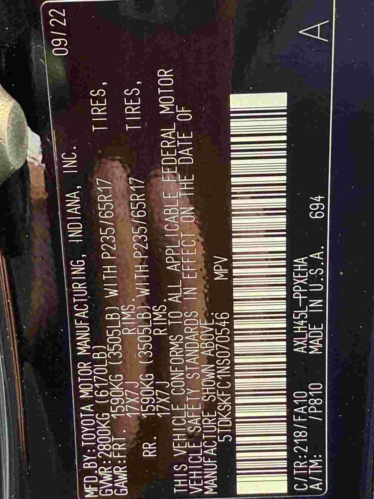 VIN: 5TDKSKFC1NS070546